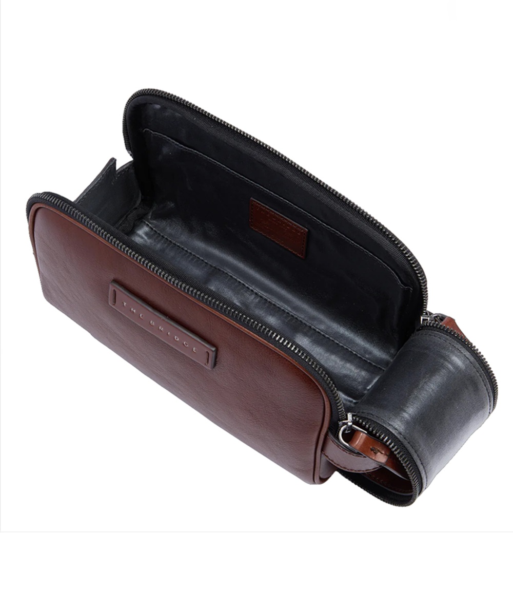 Beauty Case in pelle The Bridge, accessorio funzionale realizzato in raffinata pelle, con targhetta frontale logata. COLORE MARRONE