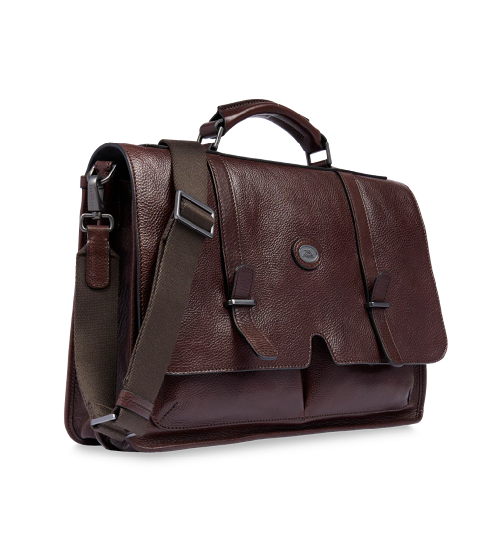 Cartella in pelle grande The Bridge con tracolla regolabile, tasche frontali e chiusura patta, elegante e pratica. COLORE CASTAGNA