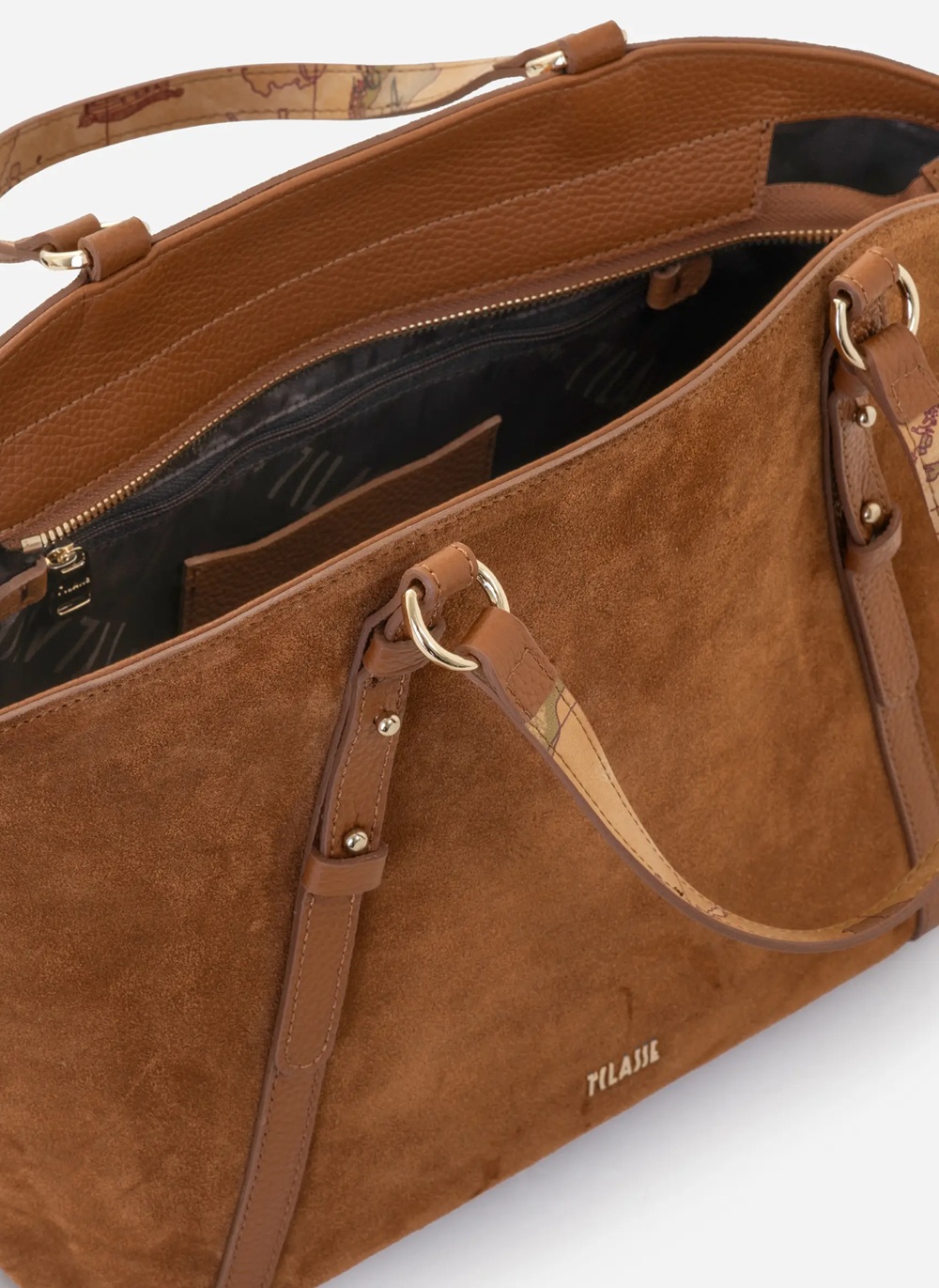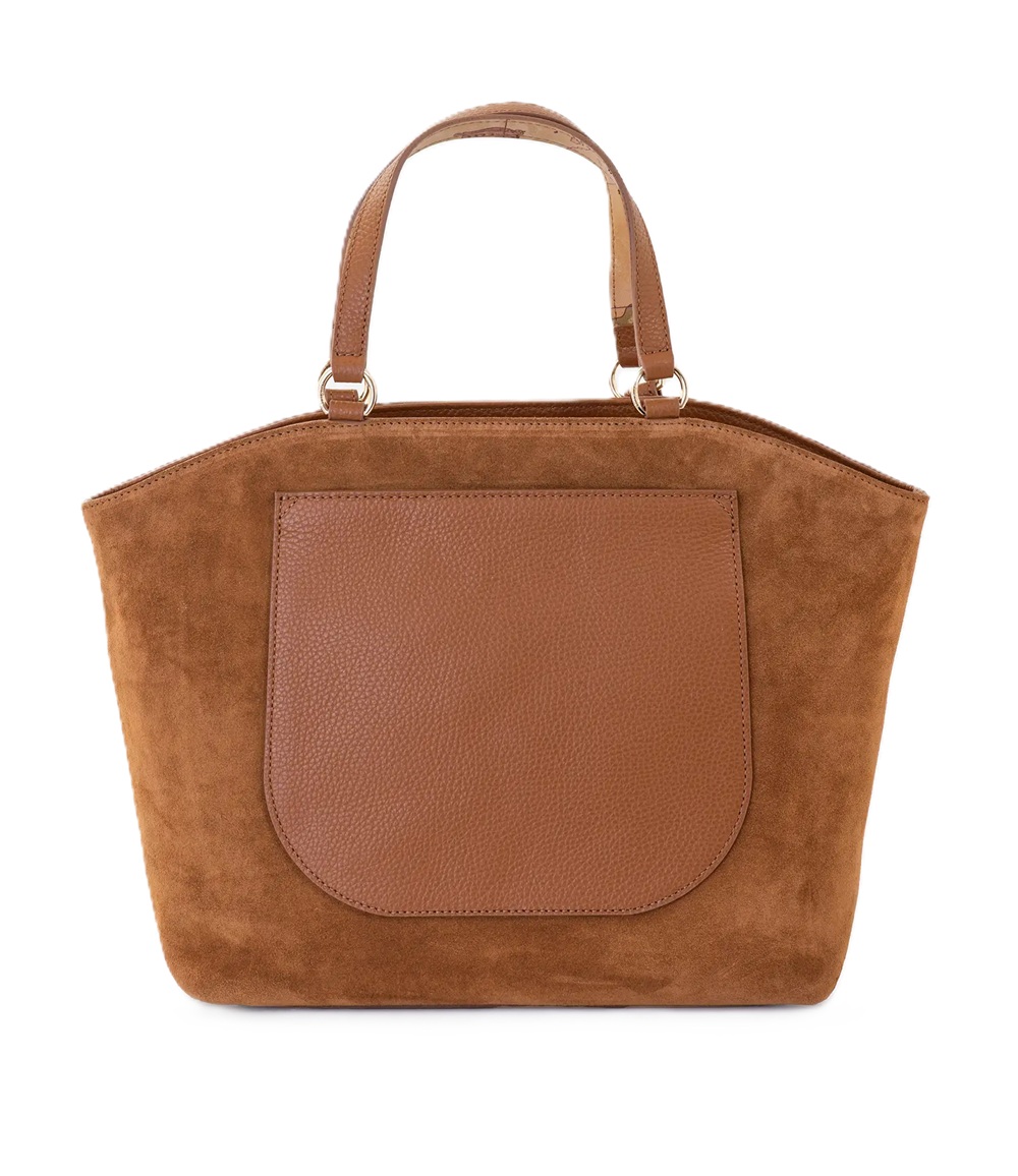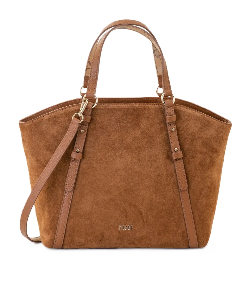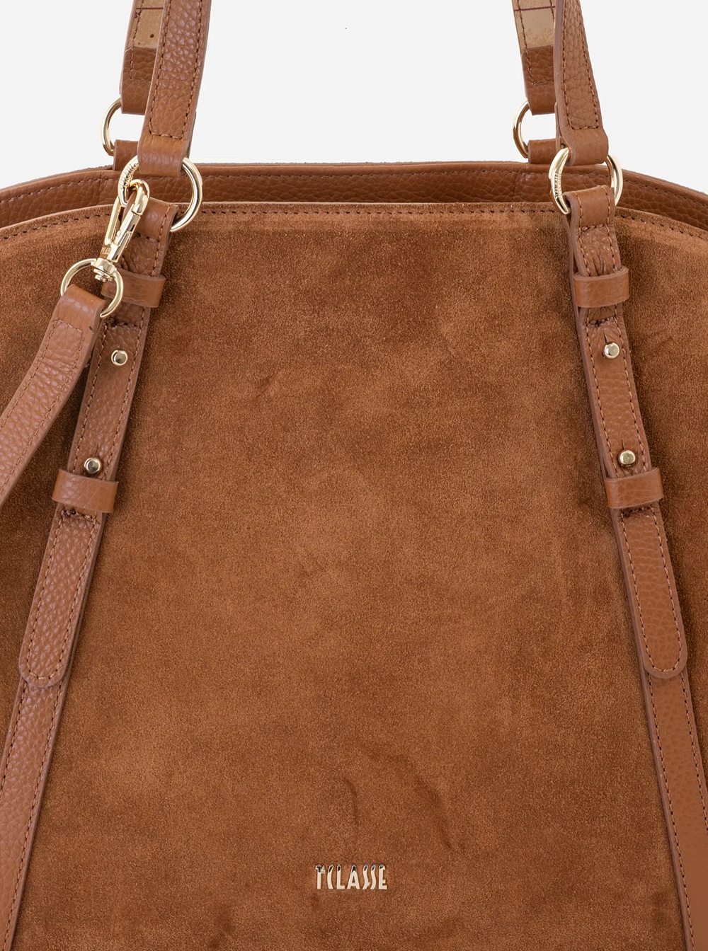 La borsa a mano Wild Leather interpreta i paesaggi della Scozia attraverso il mix di pelle scamosciata e granata, dall’effetto naturale e sofisticato. I due materiali esaltano diversamente i colori di Collezione, illuminati dall’oro chiaro del logo 1ᴬ Classe e della metalleria lungo gli attacchi dei manici.